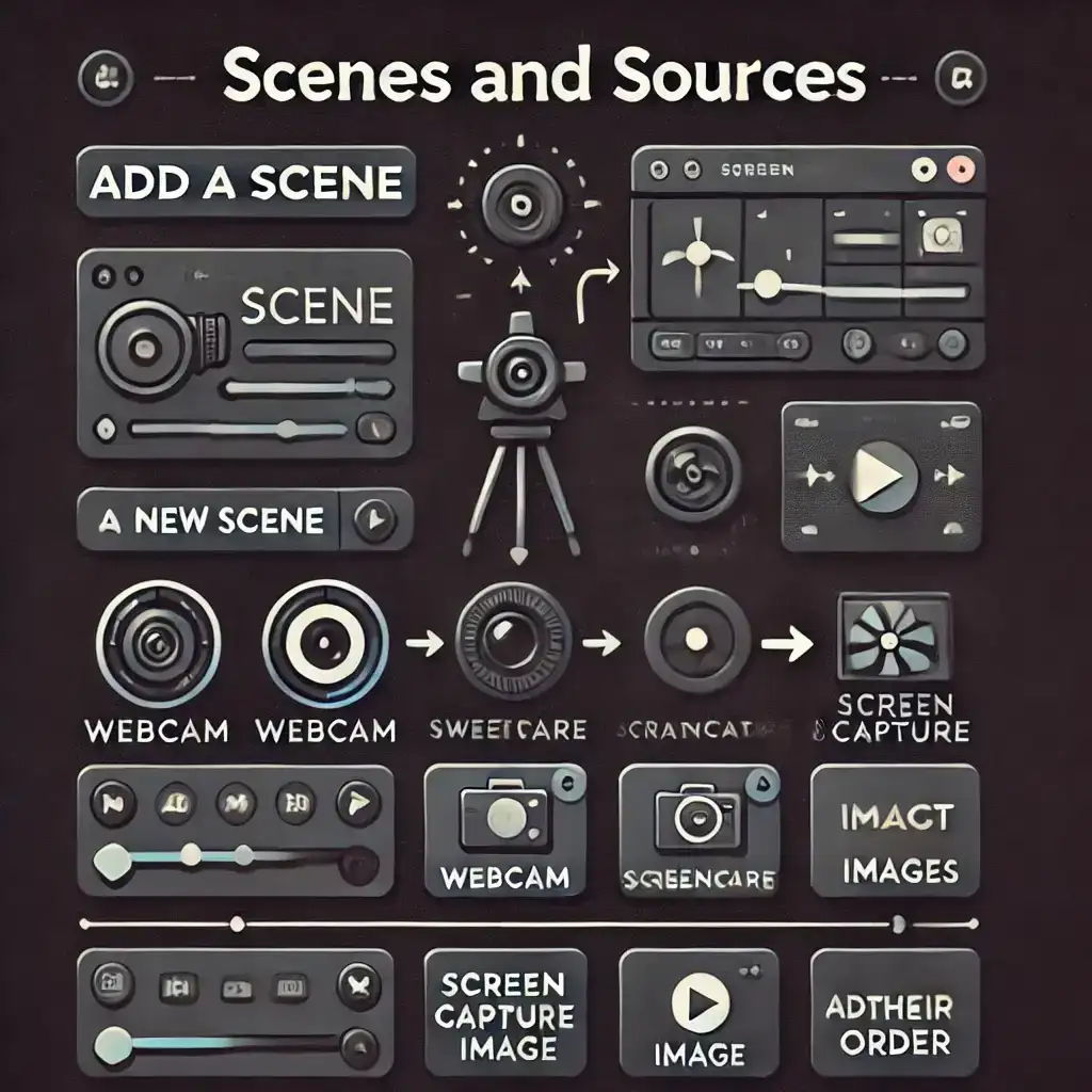 İlk kez açtığında biraz karmaşık görünebilir ama aslında öğrenmesi çok da zor değil! Birkaç YouTube rehberi izledikten sonra rahatlıkla kullanmaya başlayabilirsin. OBS Studio’nun arayüzü şu şekilde çalışıyor: